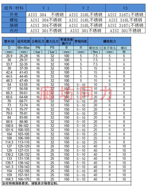 應用領域:廣泛應用于地面及地下輸油、輸氣、給排水中低壓管道的連接和修補;環保設備、食品設備、涂裝設備等設備管線的快速連接和修補;PE管線、不銹鋼管線、鍍鋅管線的低壓連接。
